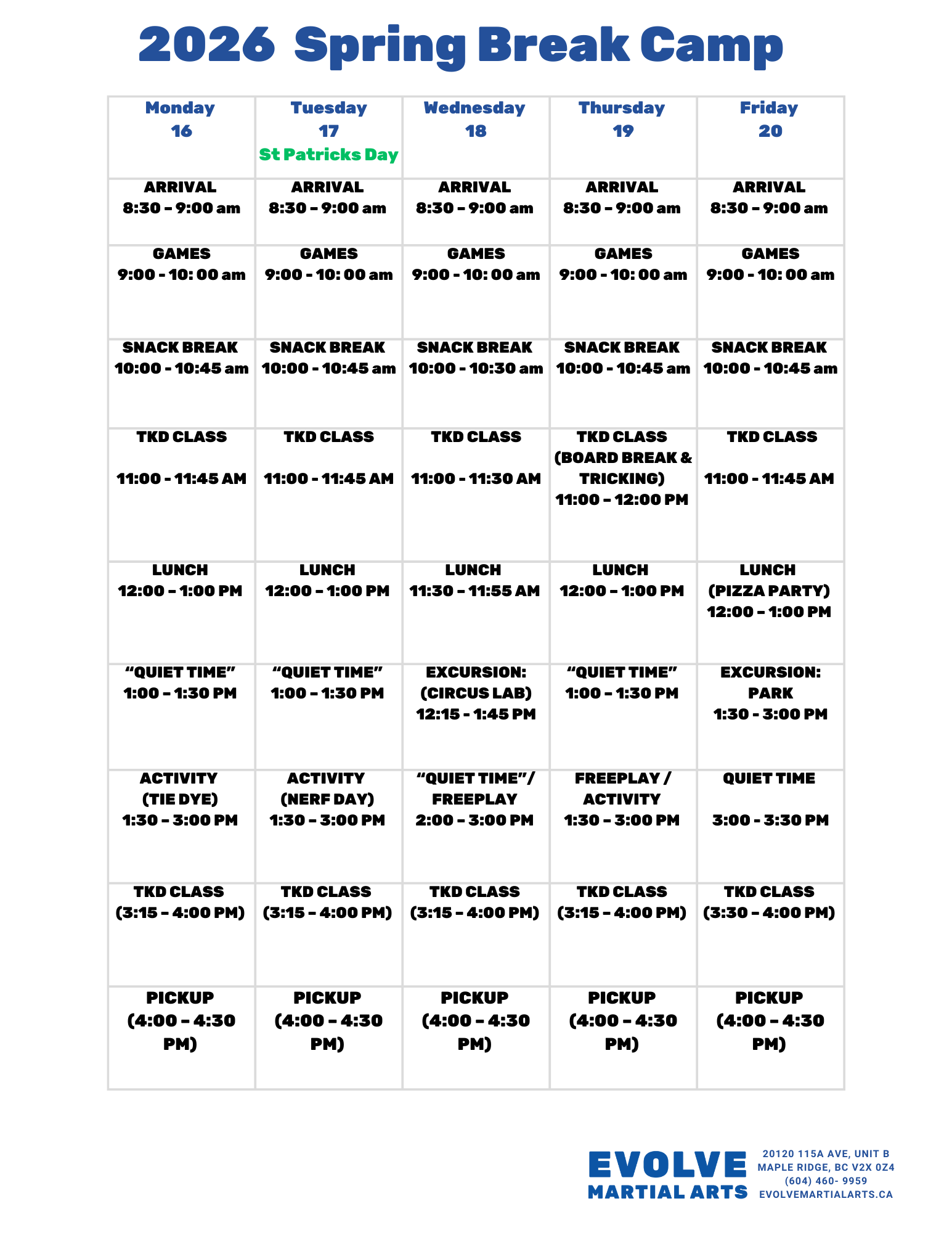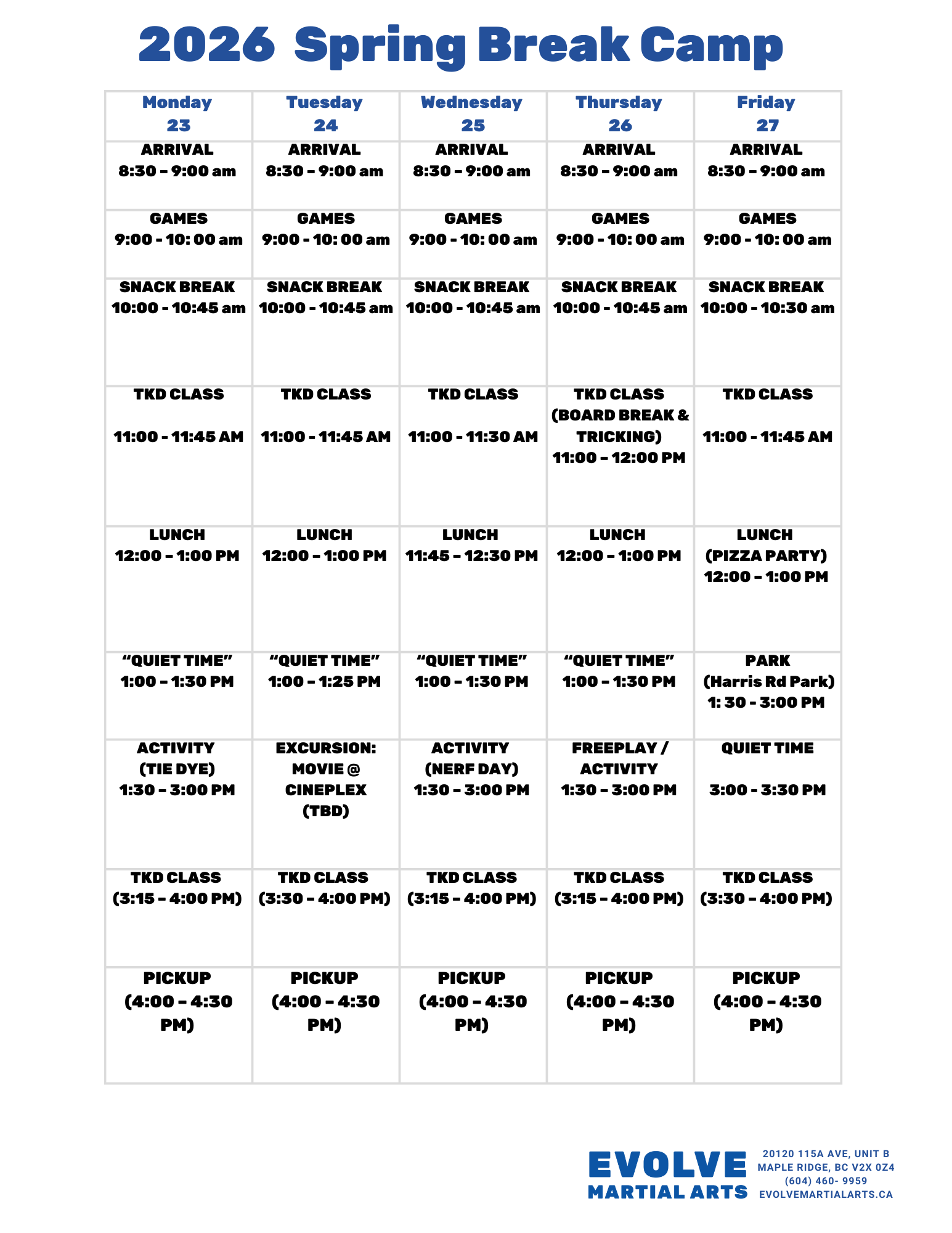 Spring Break Camp 2026 Activity Schedule: